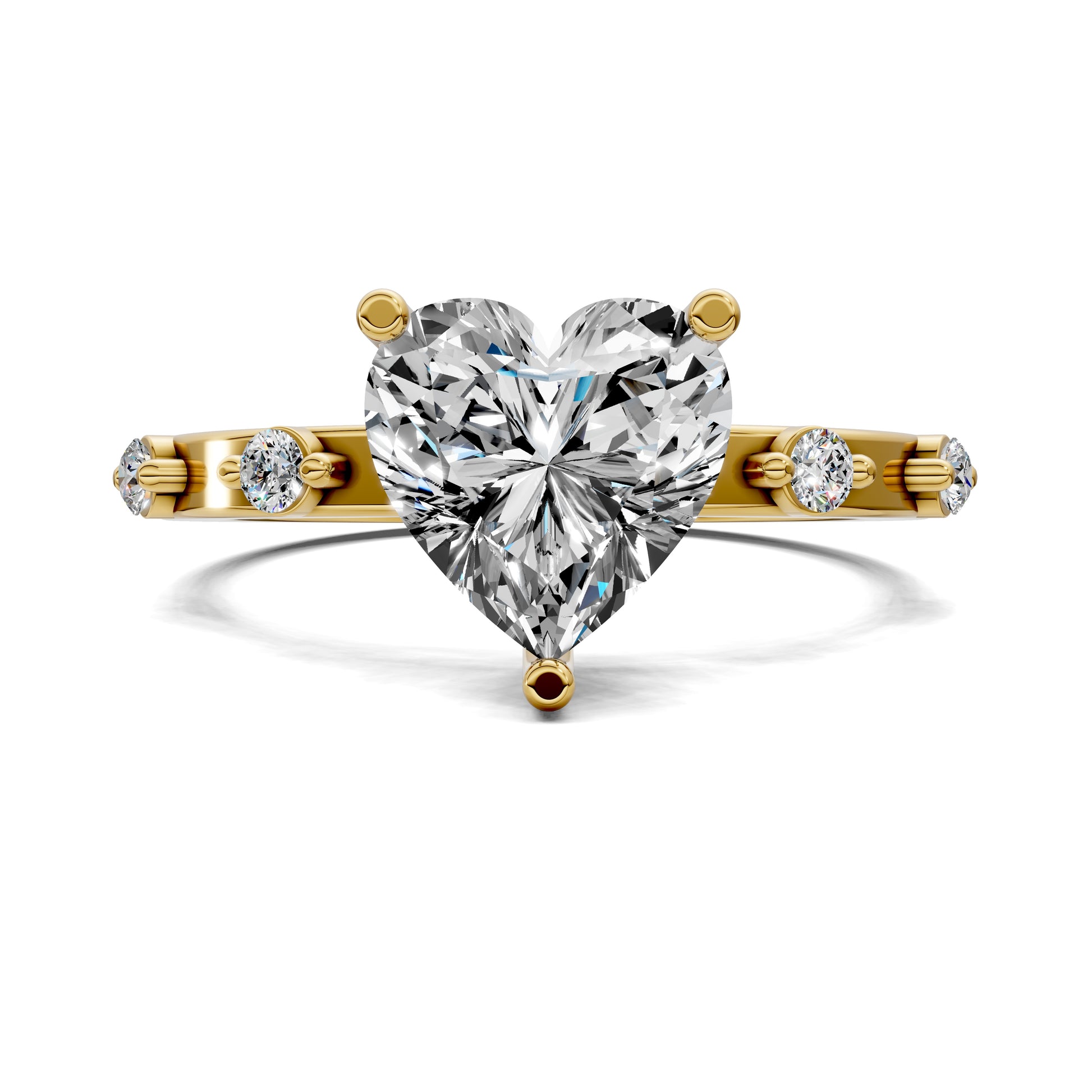 A heart-cut diamond shines at the center, framed by round diamond accents along the band. This refined design pairs bold romance with radiant detail.