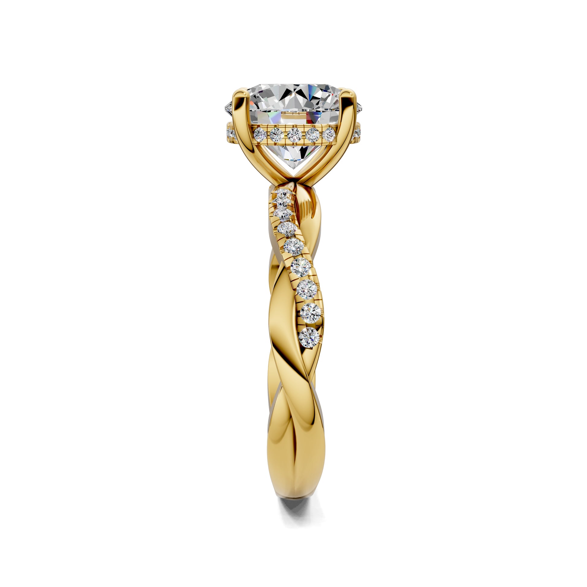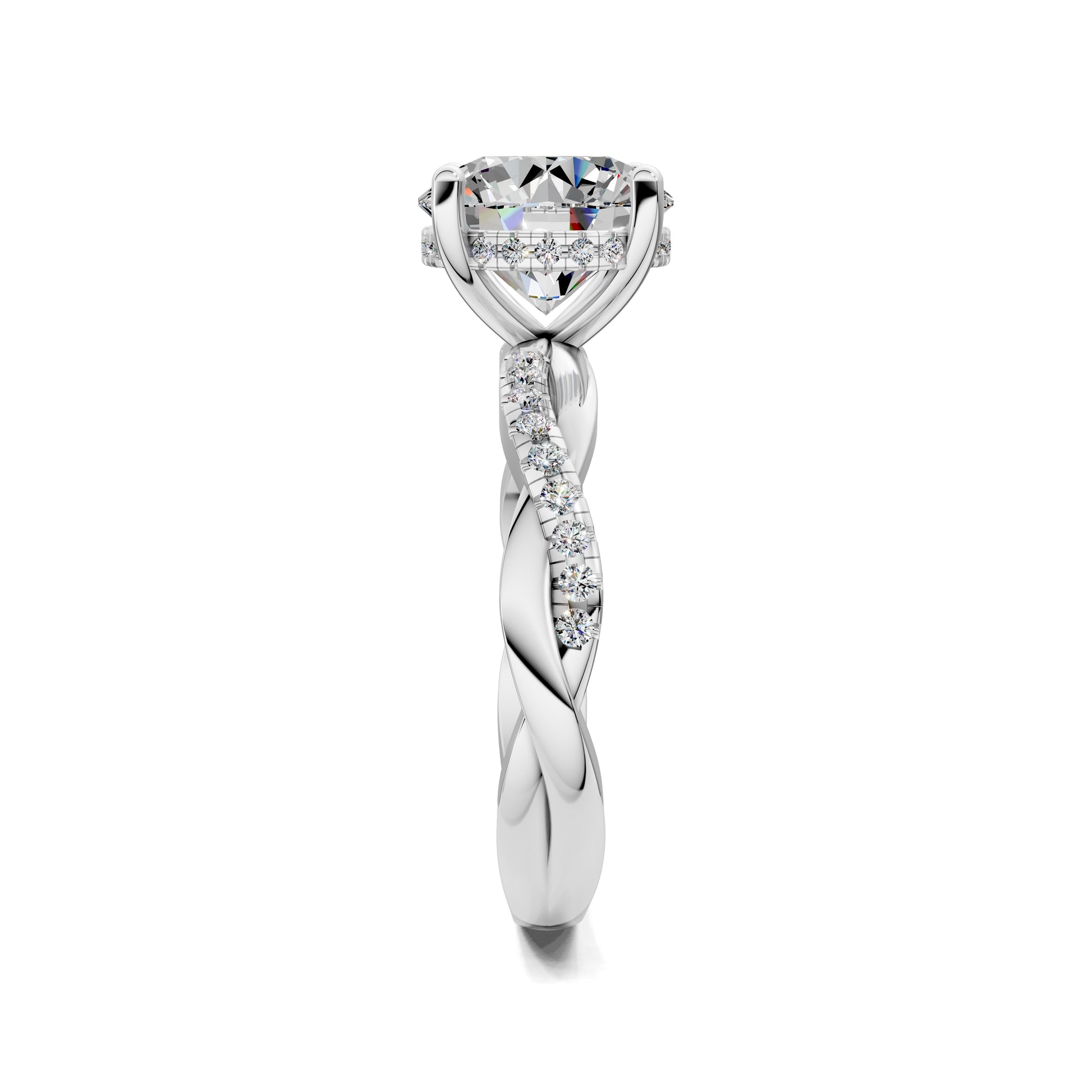 A brilliant round cut diamond takes the spotlight, set on a braided pavé band that weaves shimmer and elegance into every detail. A design of refined artistry.