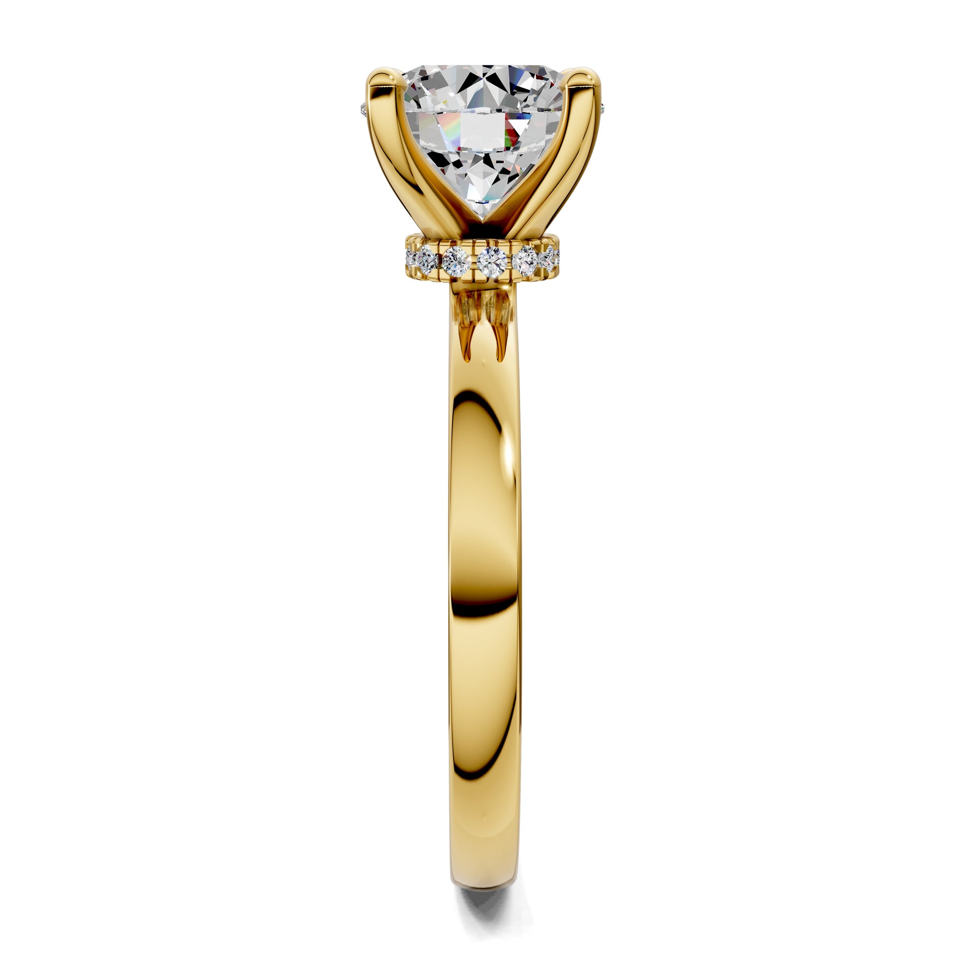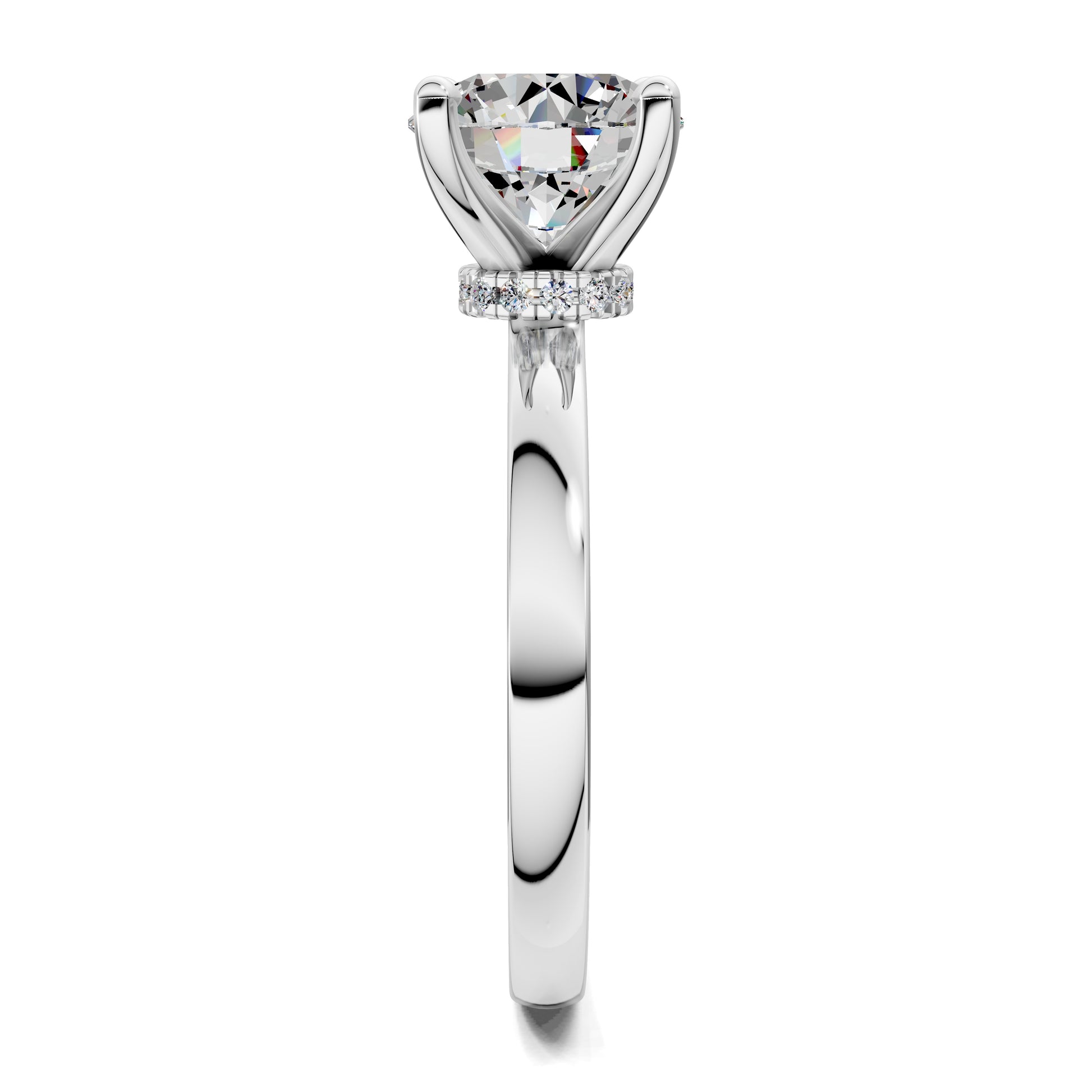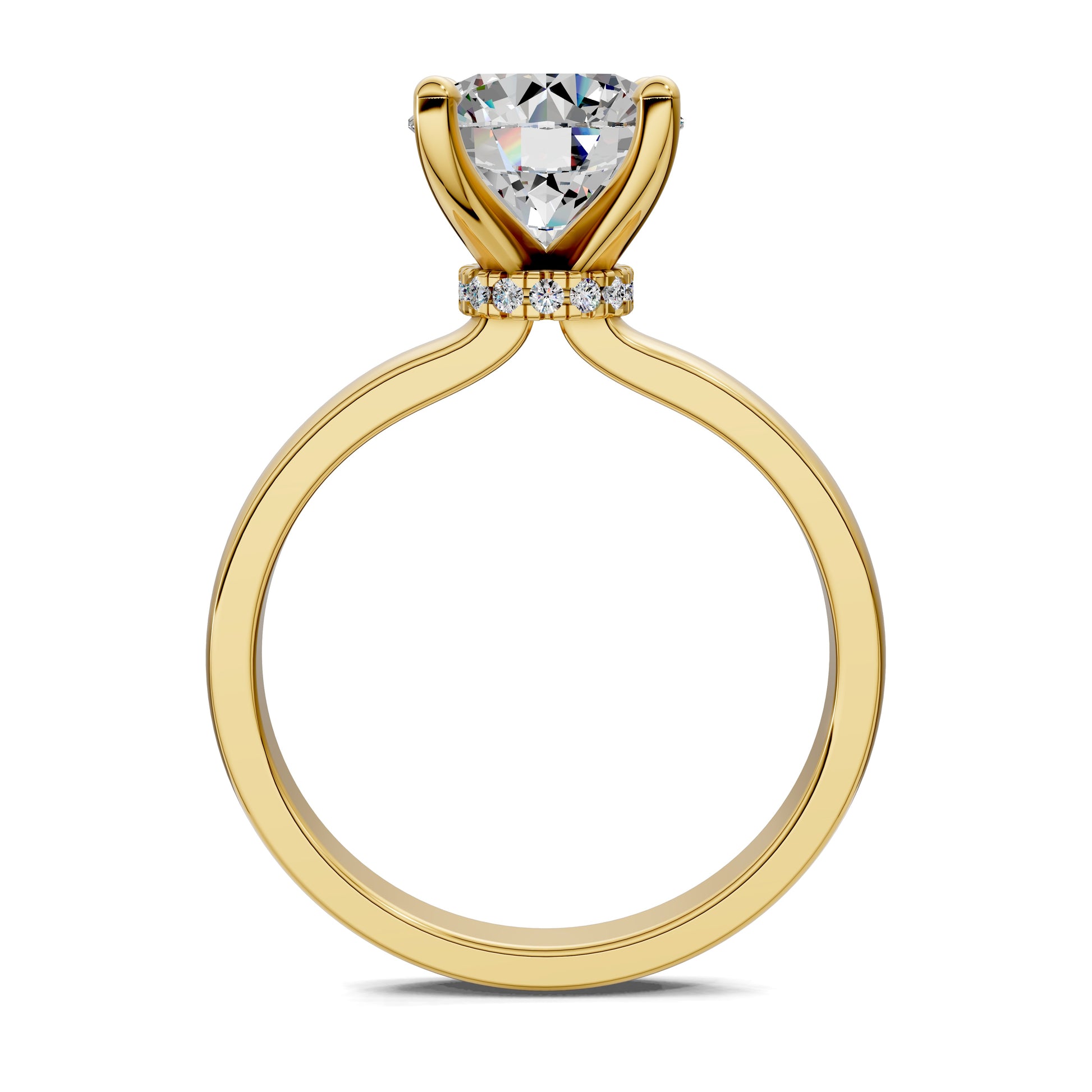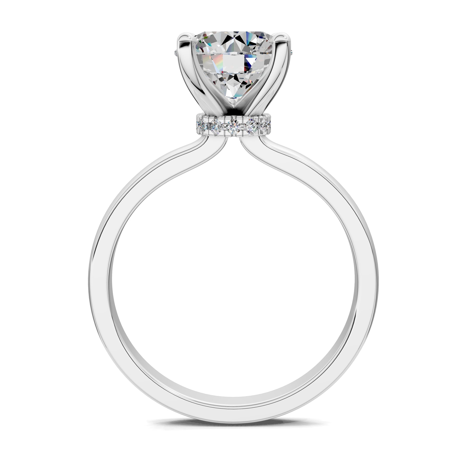 The iconic round cut diamond is elevated by a hidden halo, adding depth and radiance from every angle. A solitaire design that defines timeless elegance.
