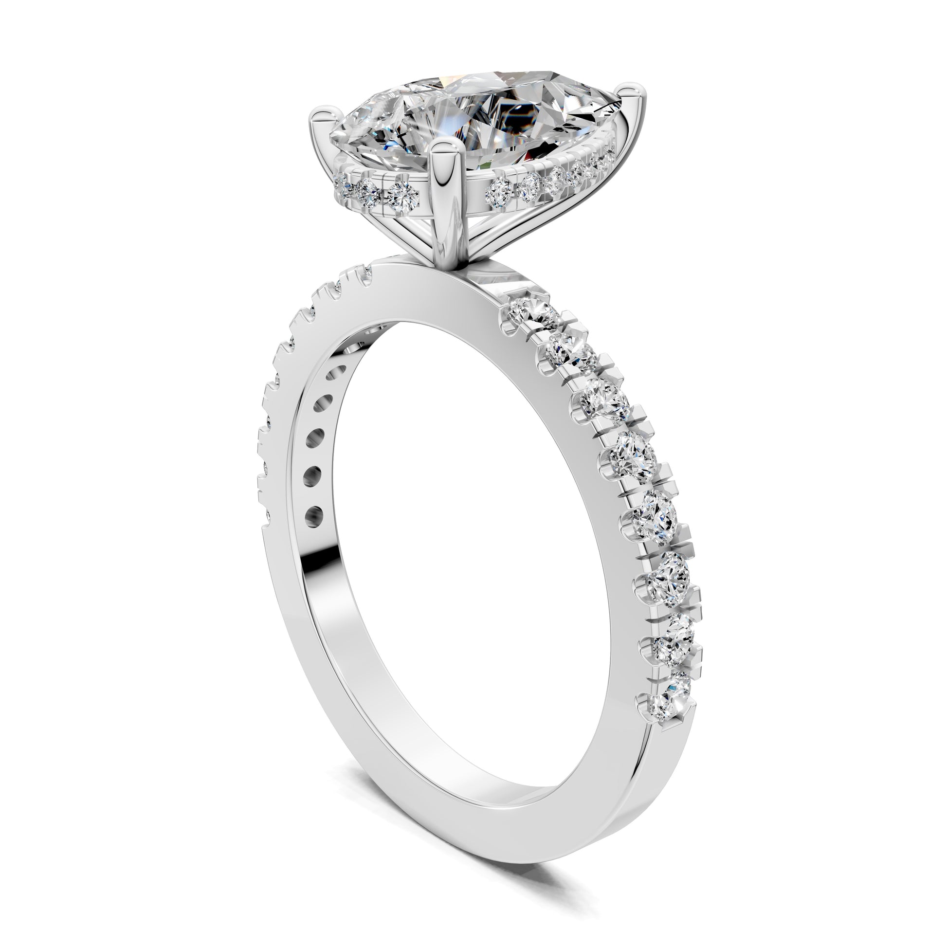 A pear-cut diamond sparkles with striking brilliance, elevated by a hidden halo and pavé diamonds along the band. A refined design that blends elegance with distinction.