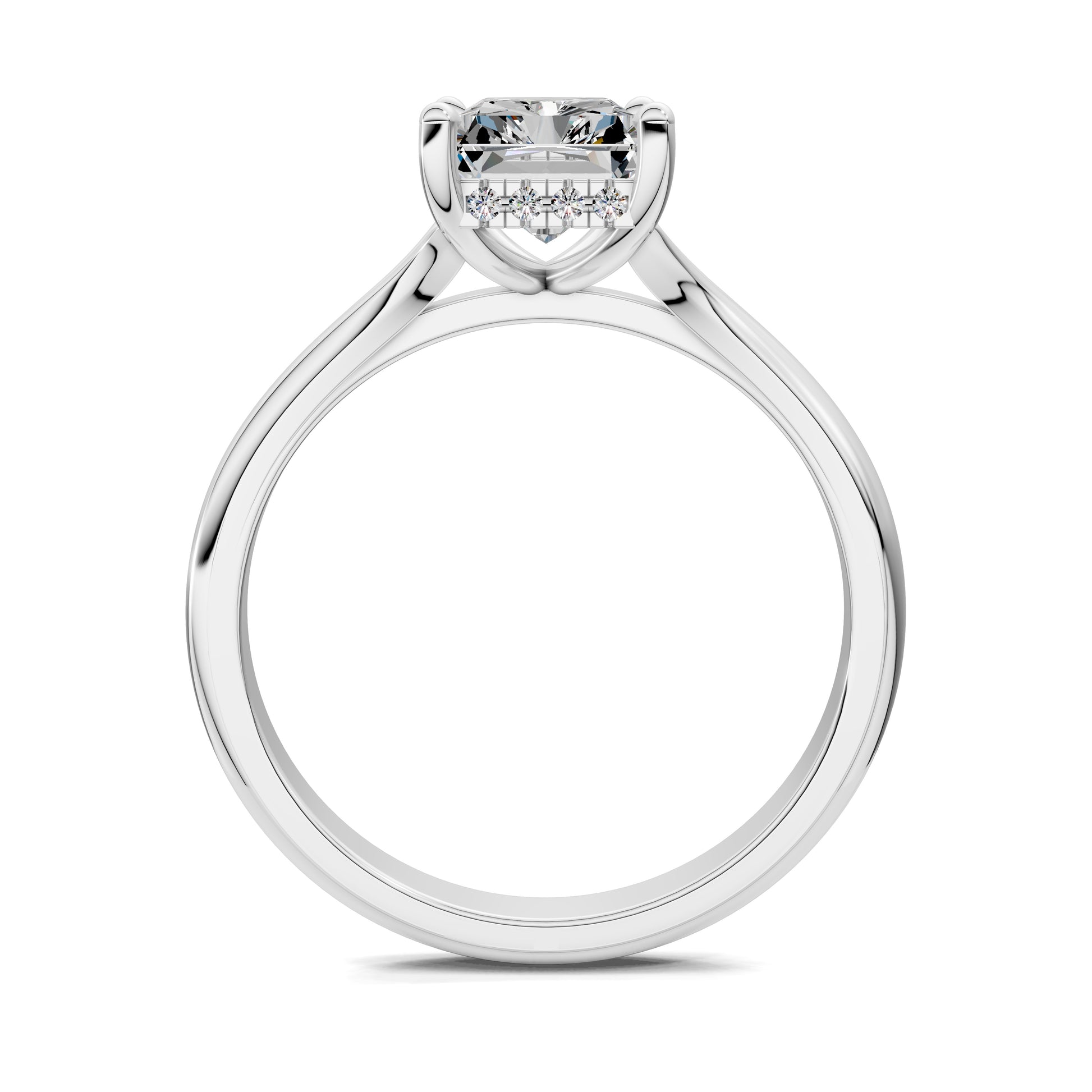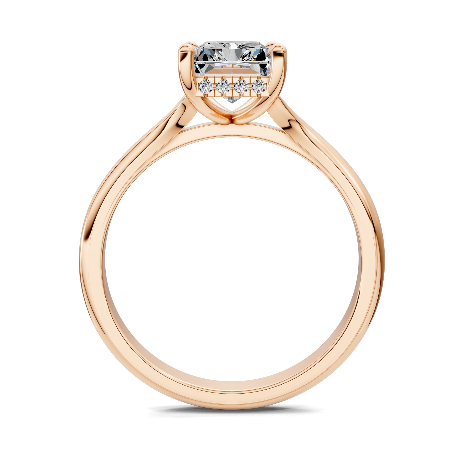 The radiant cut diamond glows with fire and sparkle, while a hidden halo adds a secret touch of brilliance. A ring that celebrates love in its most luminous form.