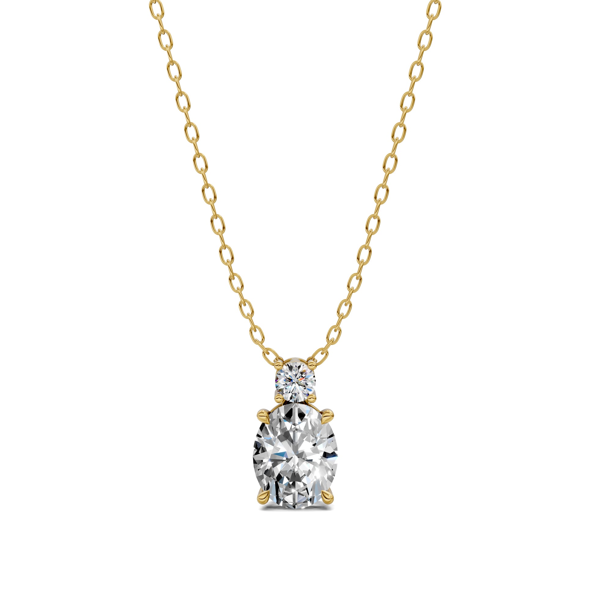 This pendant pairs the brilliance of a round diamond with the elongated elegance of an oval. Set in warm yellow gold, the design balances timeless sophistication with modern charm. A versatile piece, perfect for layering or wearing on its own.