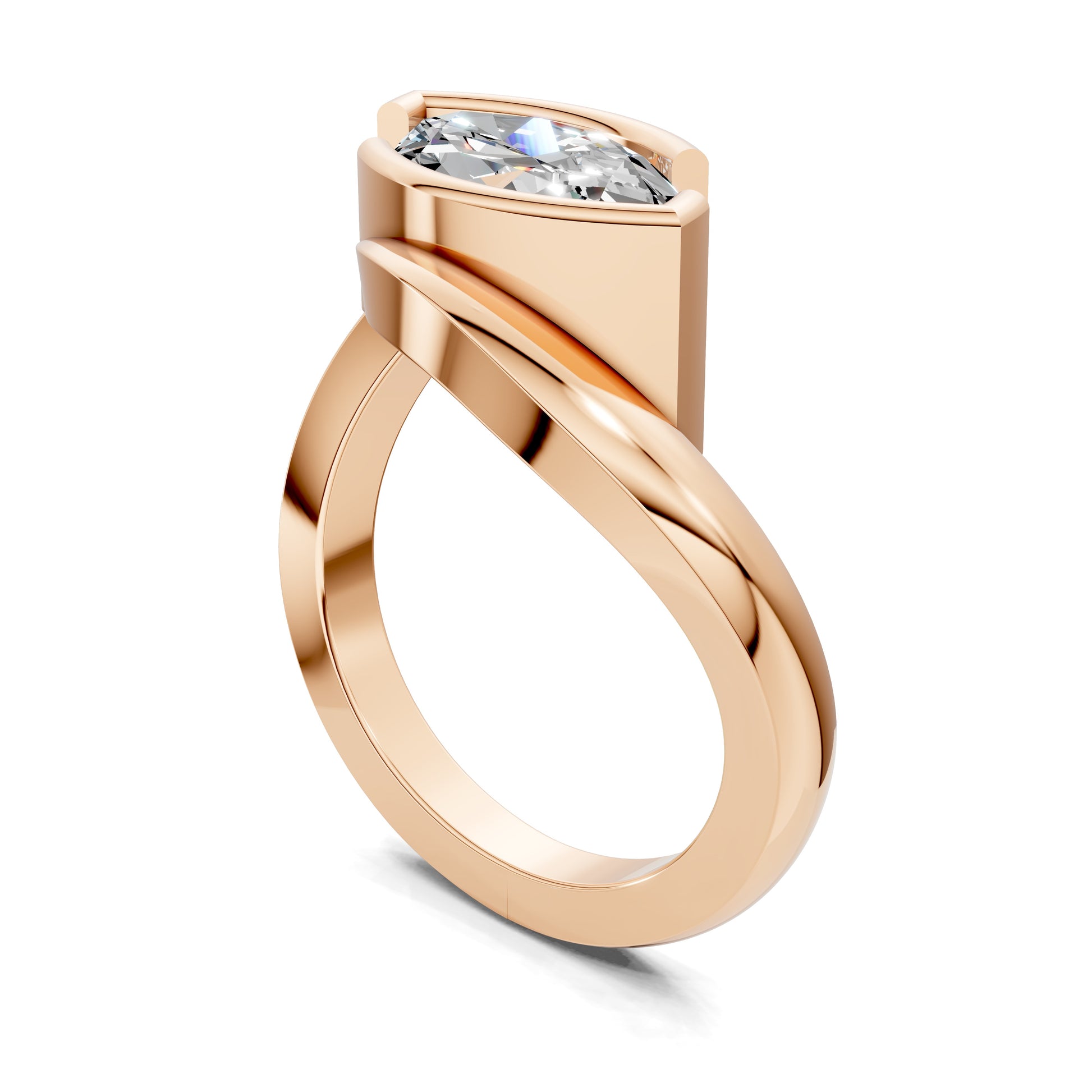 A marquise cut diamond is embraced by a sculptural bezel-style bypass band, creating a design that is both striking and refined. A statement piece with modern elegance.