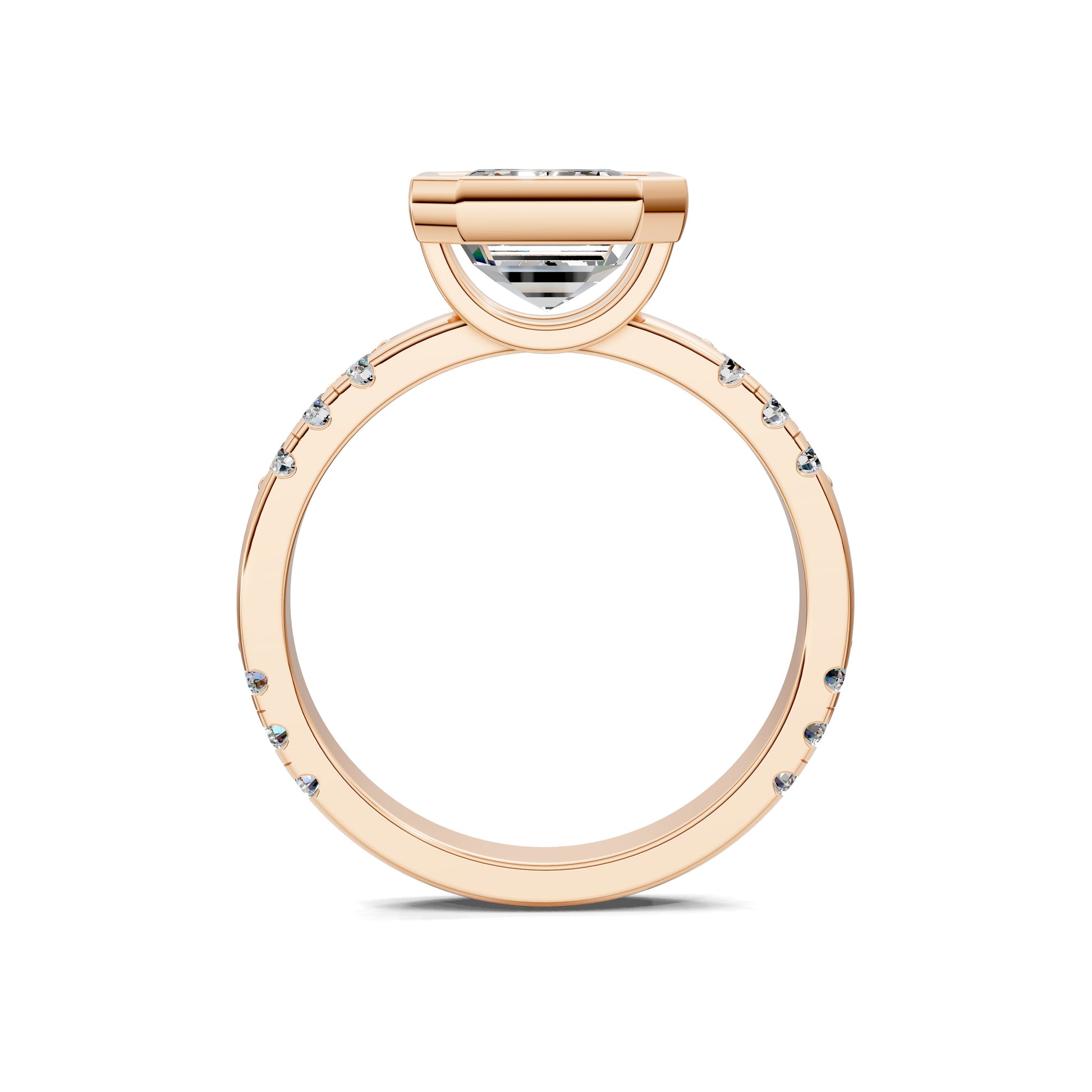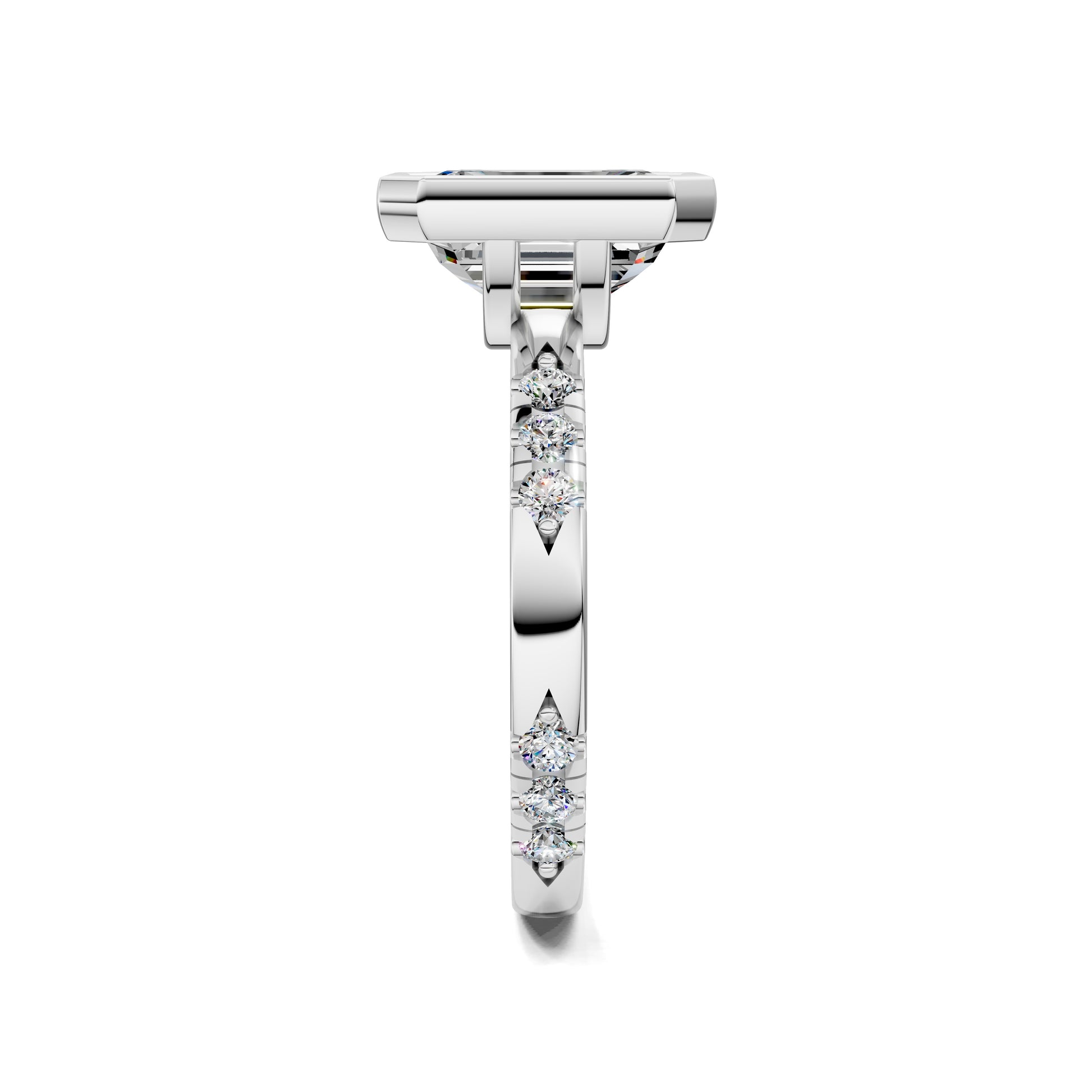 An emerald cut diamond sits in a bold bezel setting, complemented by tapered diamond accents along the band. A modern design that highlights structure and brilliance.
