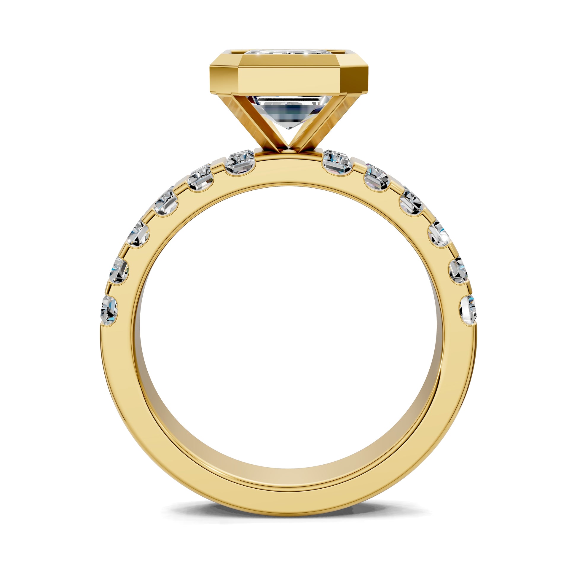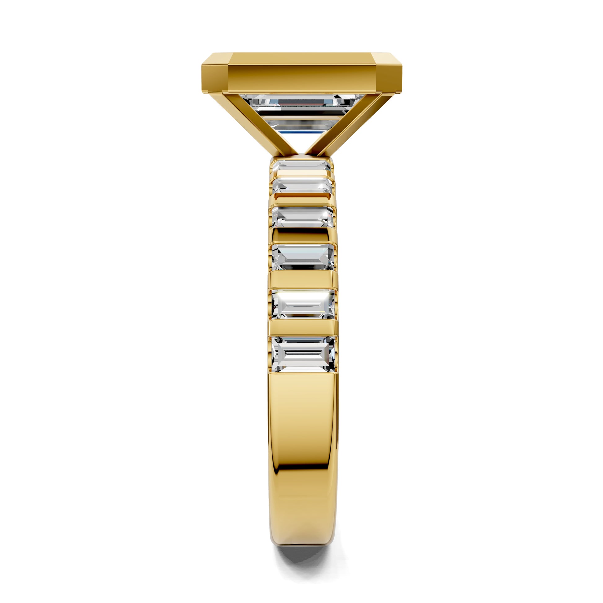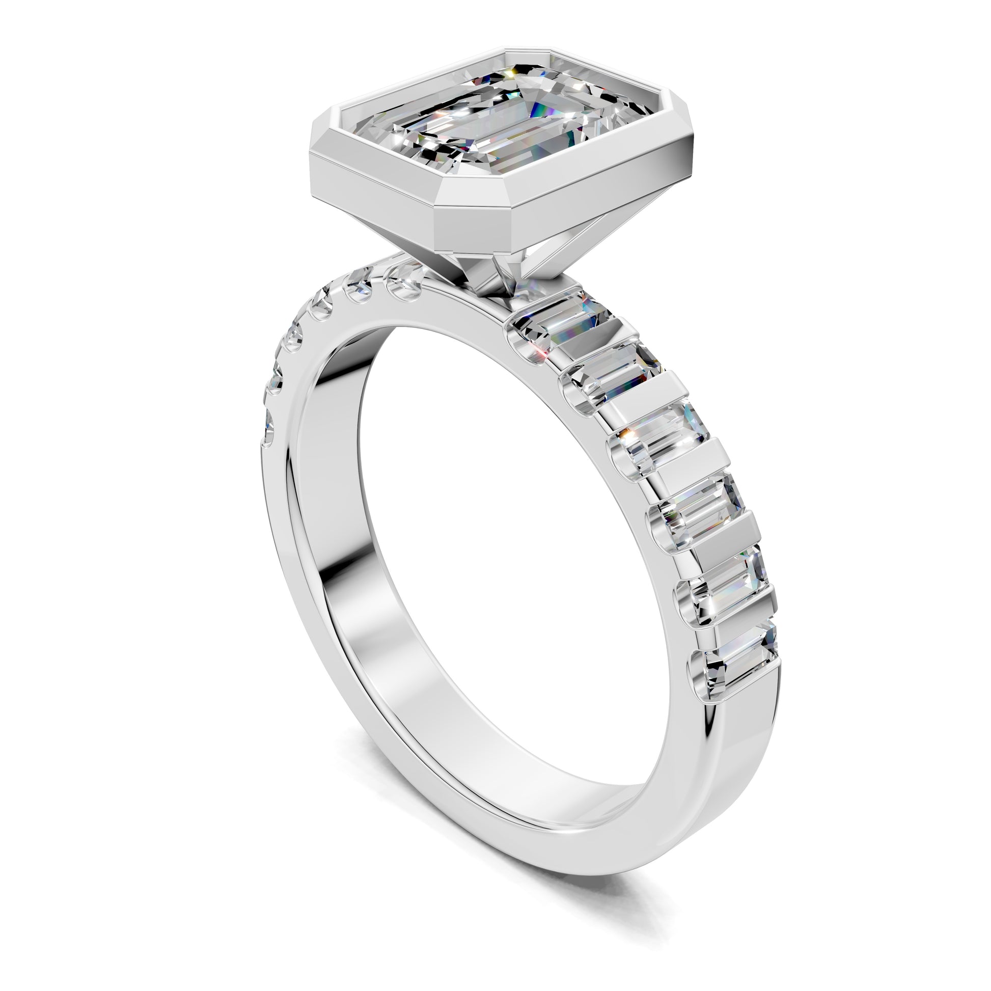 Emerald cut diamond engagement ring with bezel setting and baguette band. A modern yet timeless design that blends geometric precision with continuous brilliance.