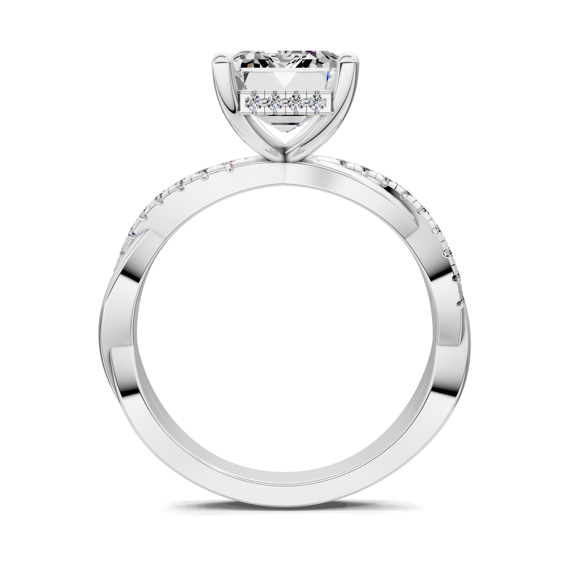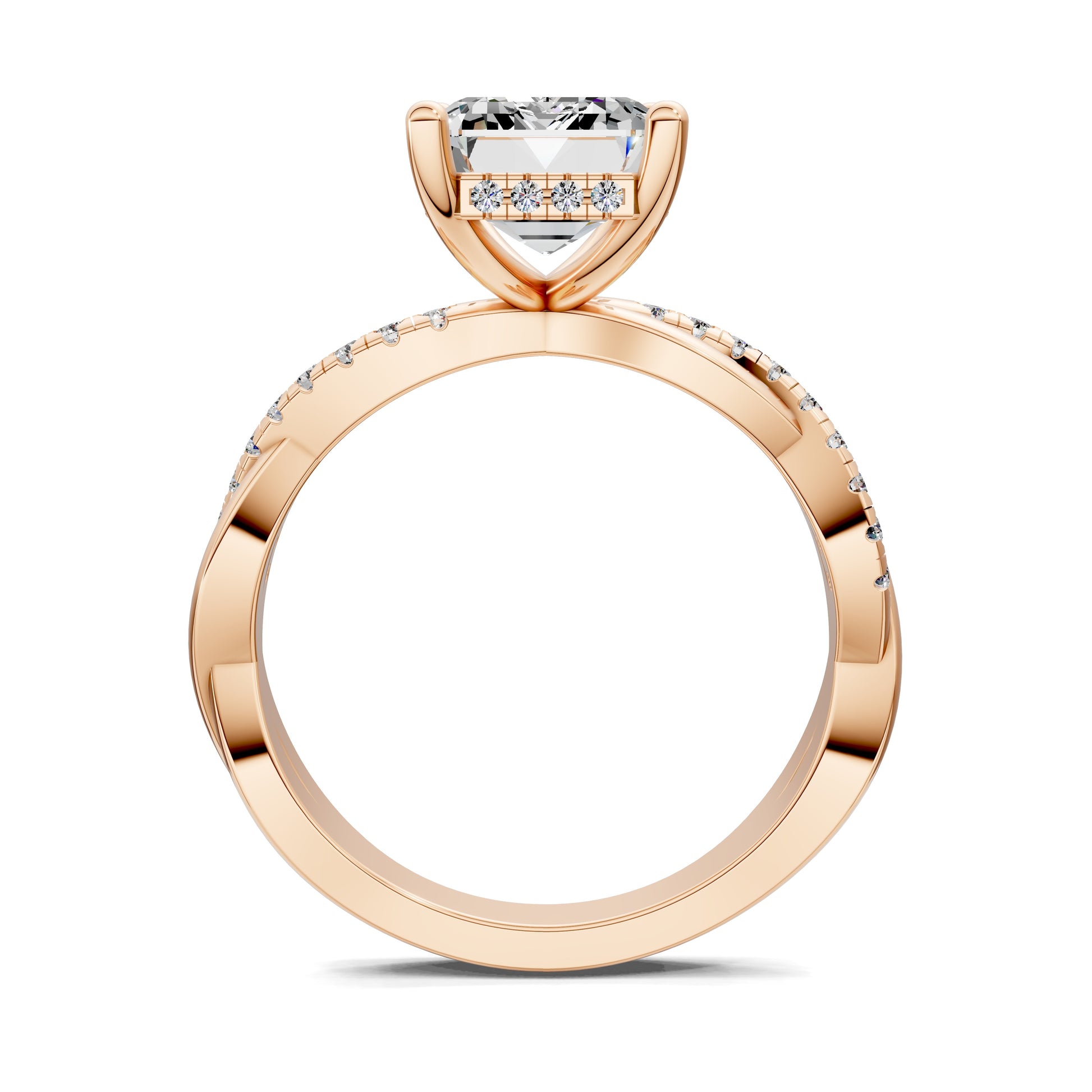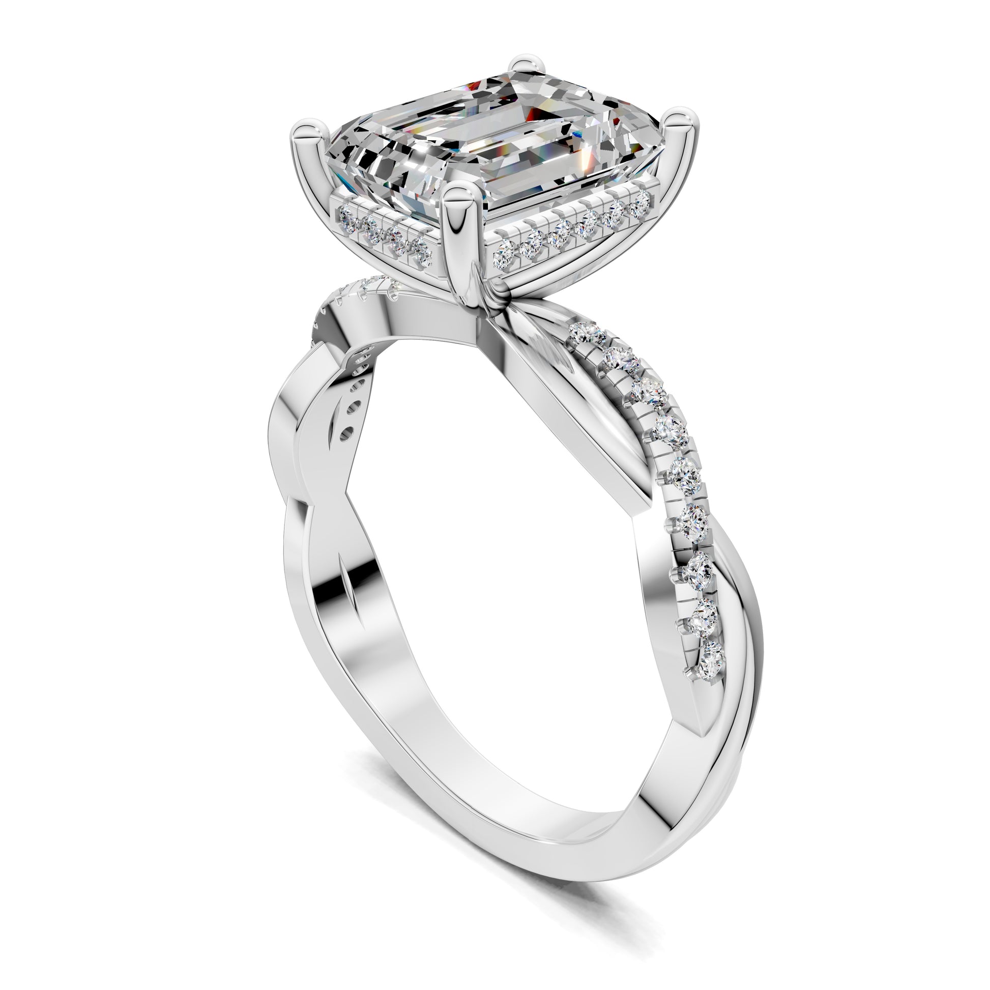 An emerald cut diamond reveals its hall-of-mirrors brilliance, set on a braided pavé band that adds texture and sparkle. A bold design that unites structure with artistry.