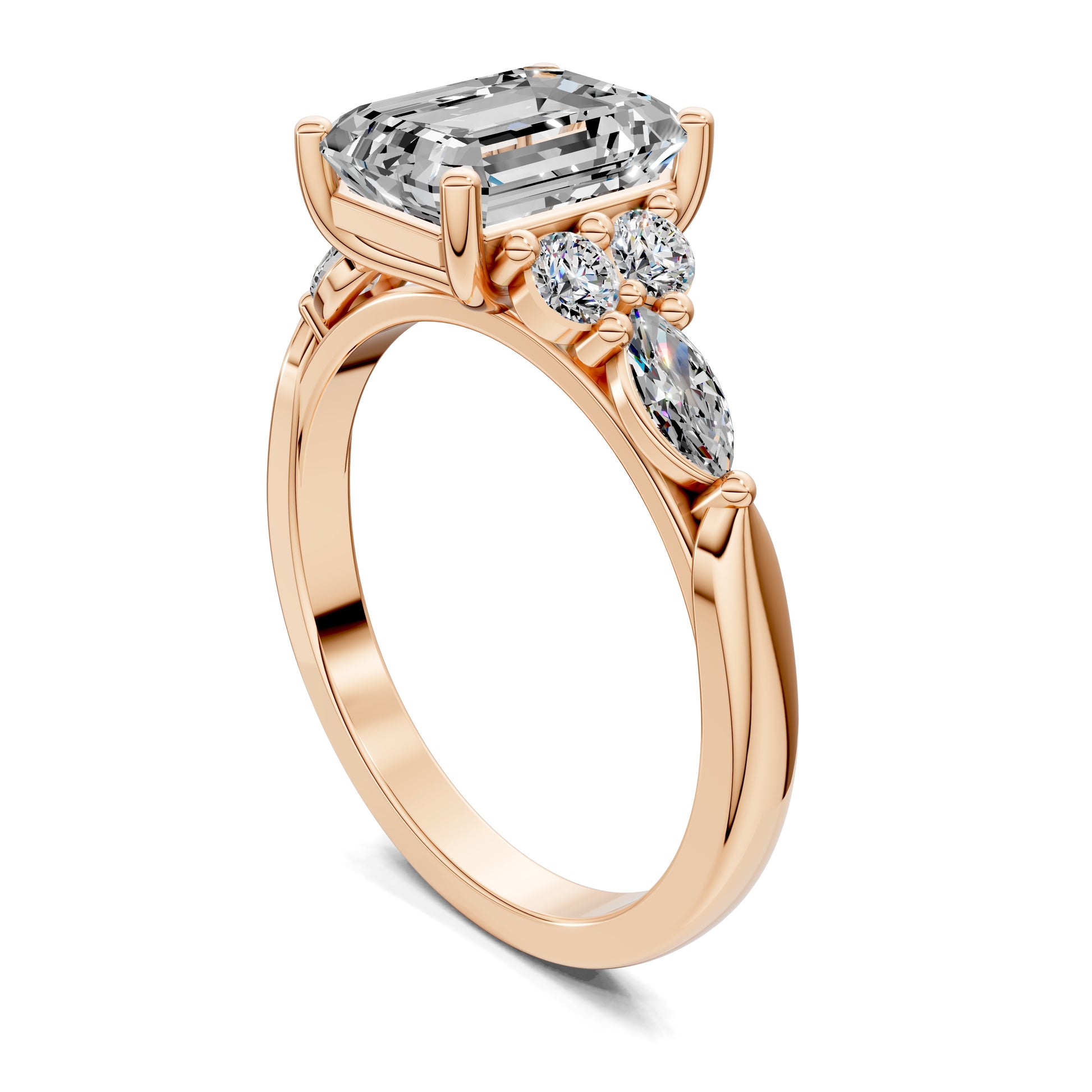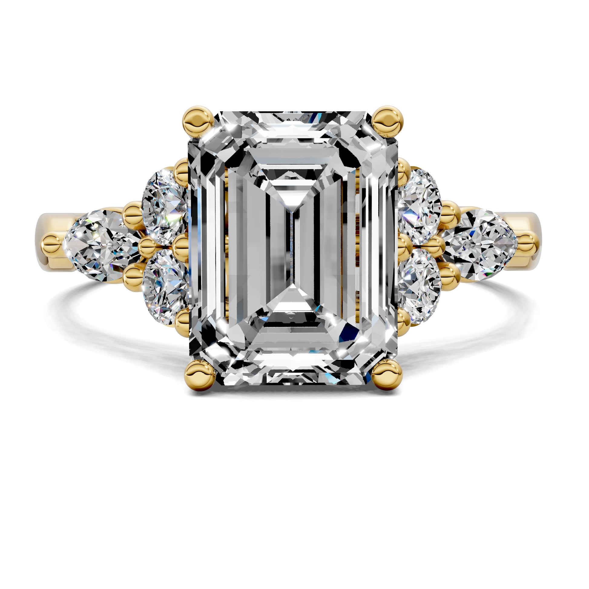 An emerald cut diamond stands tall at the center, framed by clusters of side stones that add depth and radiance. A bold yet refined design with dramatic brilliance.