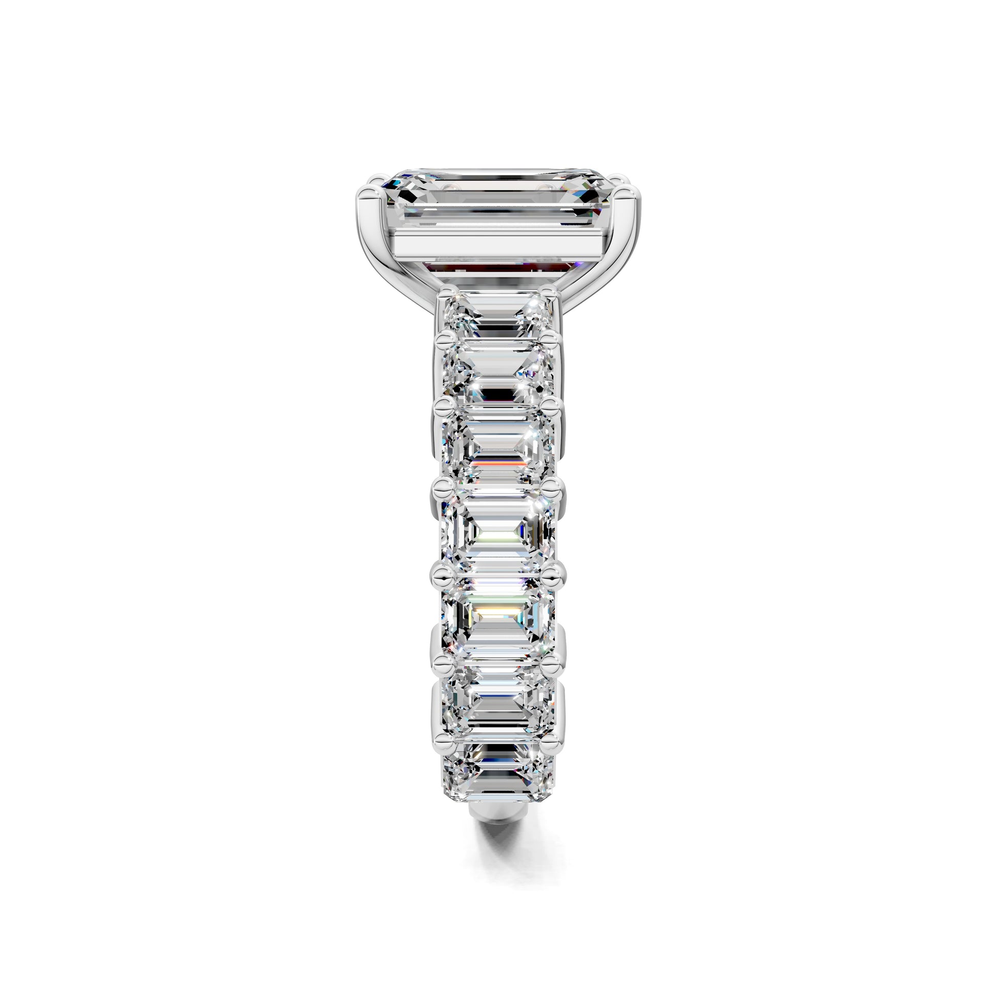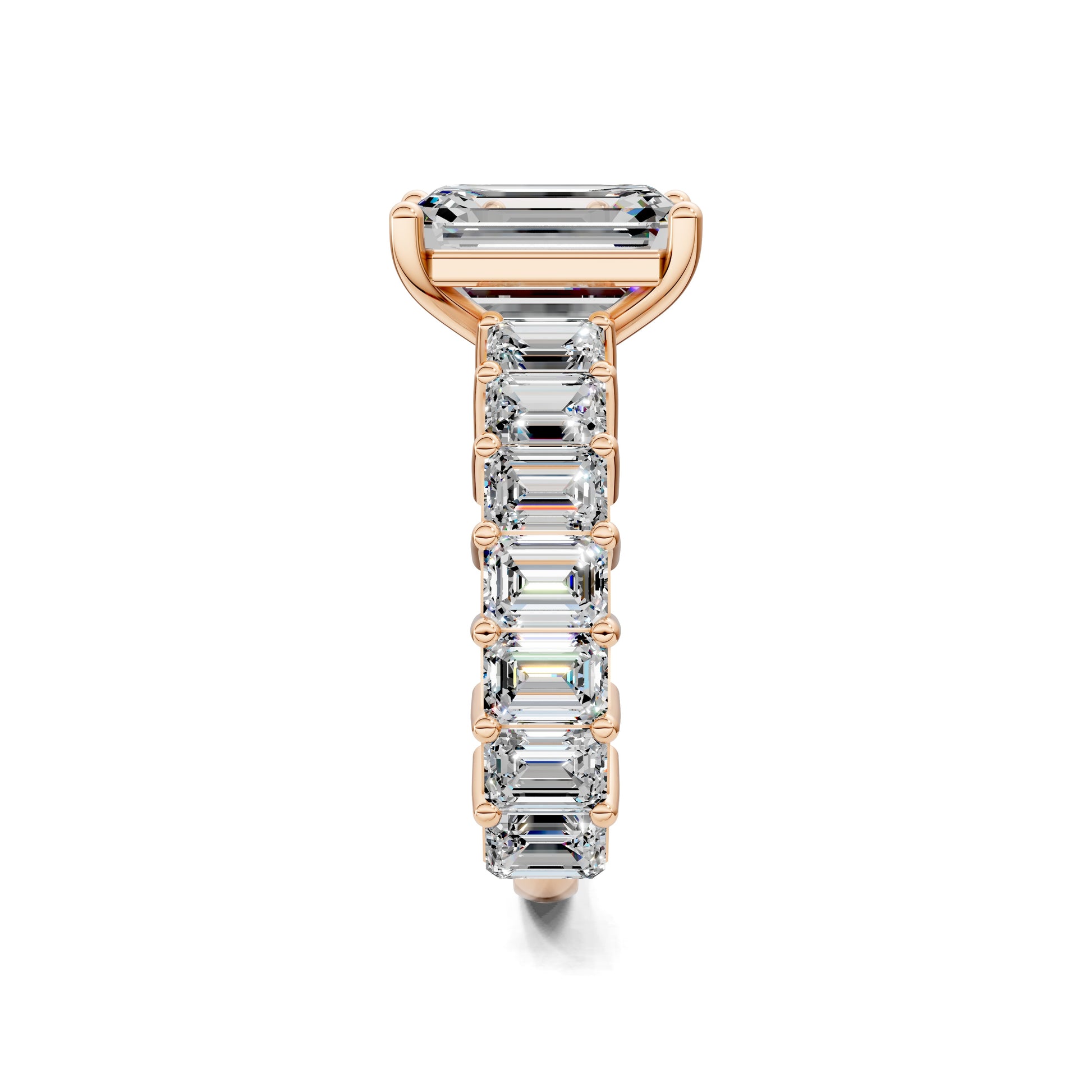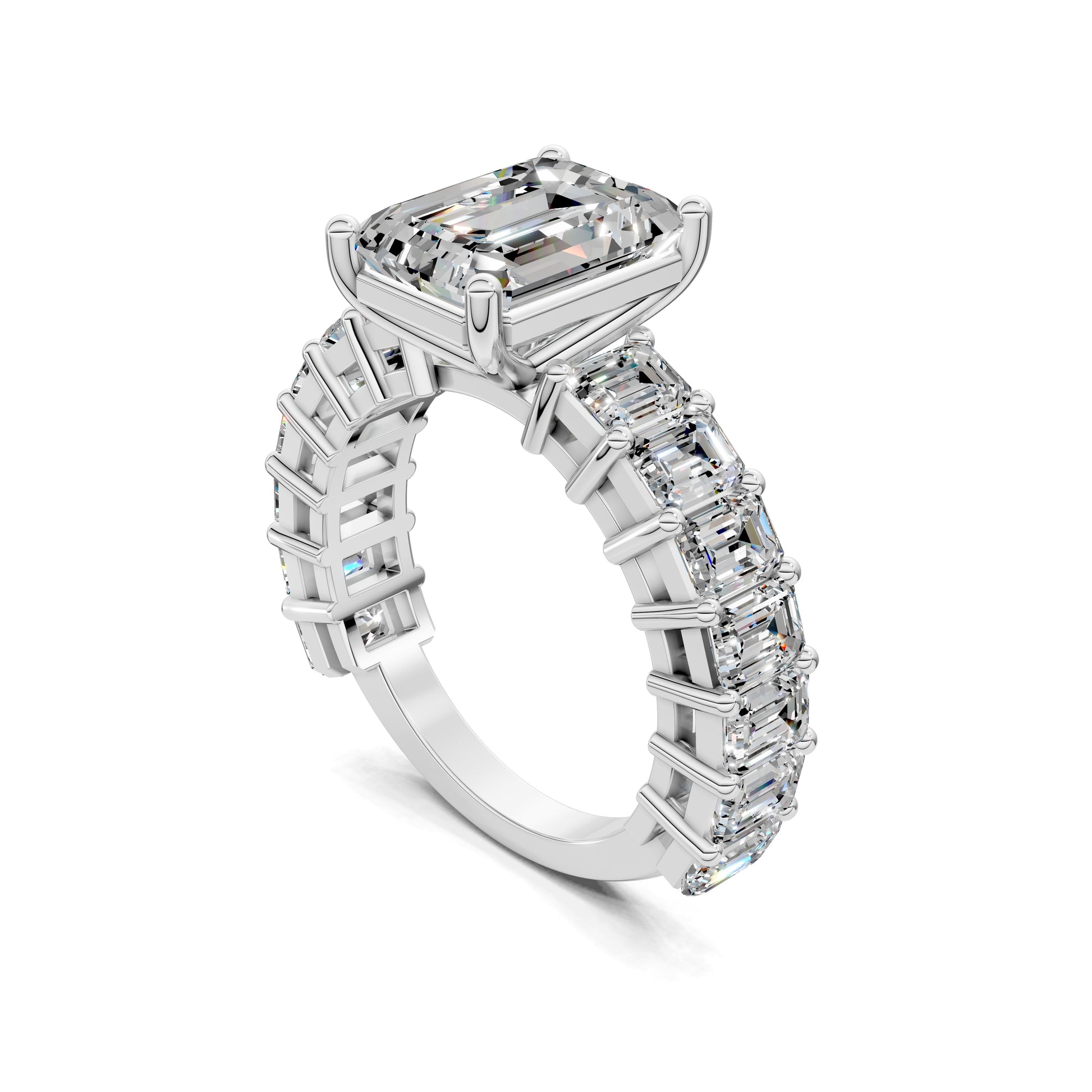 An emerald cut diamond is set in a band of matching emerald-cut stones, creating a seamless flow of brilliance. A bold, architectural design that radiates luxury from every angle.
