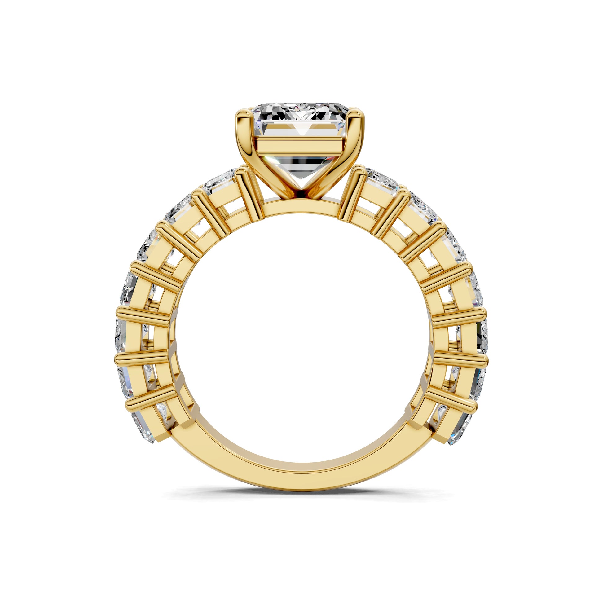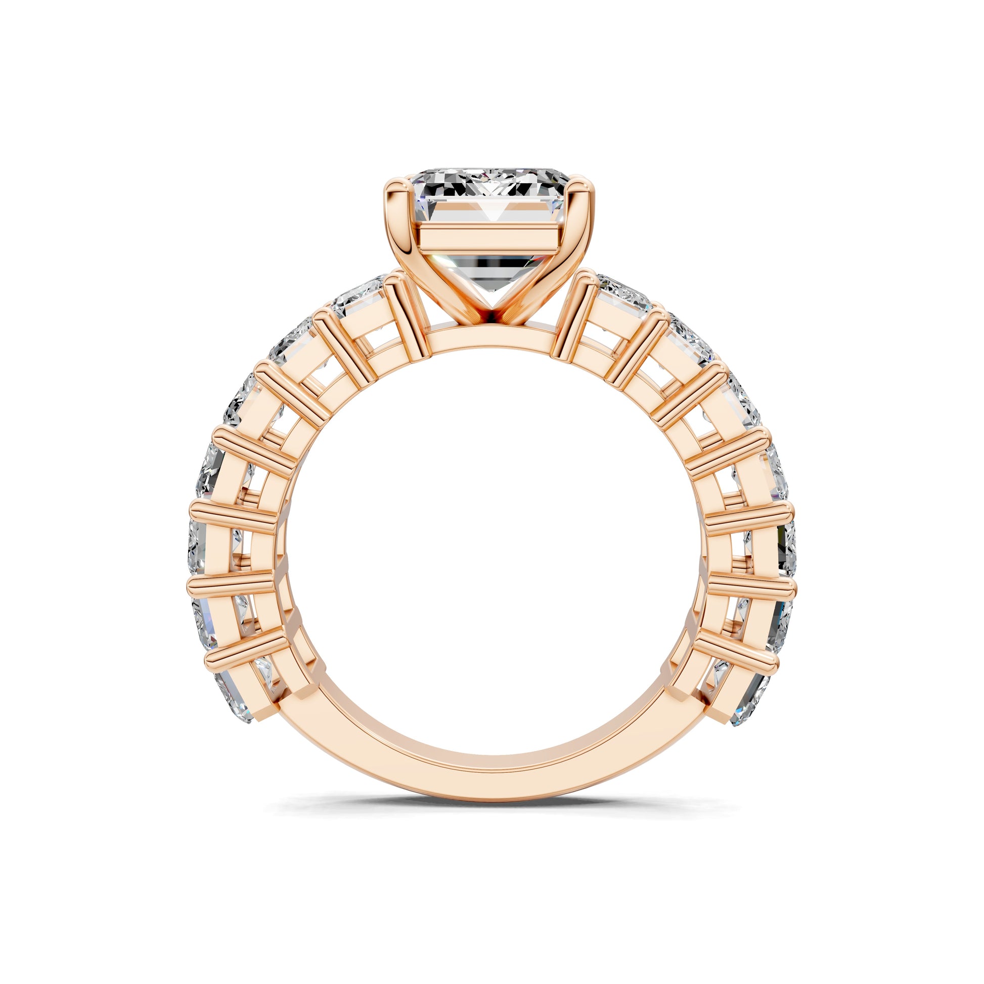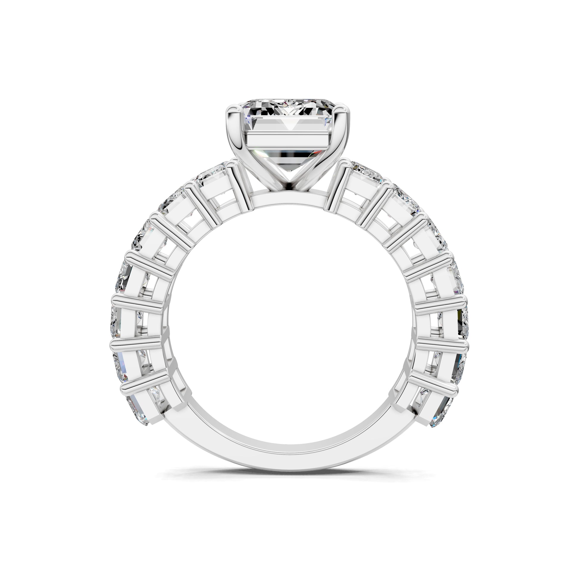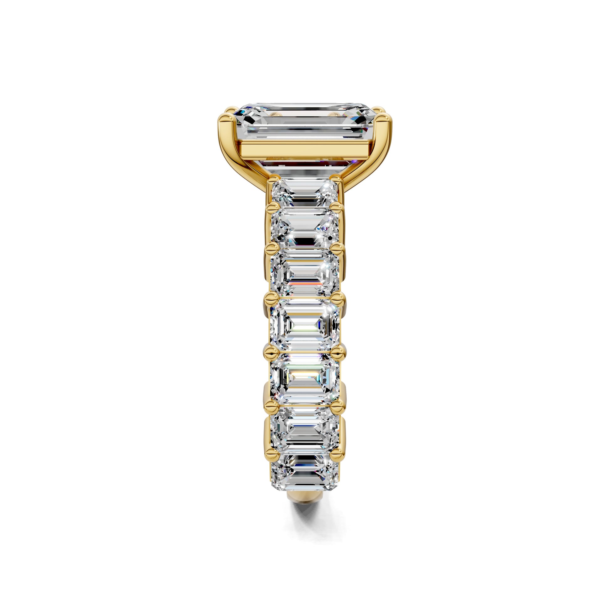An emerald cut diamond is set in a band of matching emerald-cut stones, creating a seamless flow of brilliance. A bold, architectural design that radiates luxury from every angle.