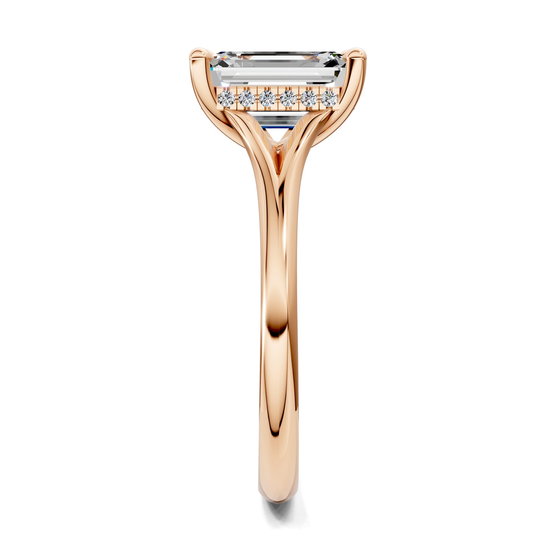 Strong, elegant, and full of grace, the emerald-cut diamond shines with a quiet glow. A hidden halo beneath the center stone adds a secret sparkle, just like love’s most intimate moments.