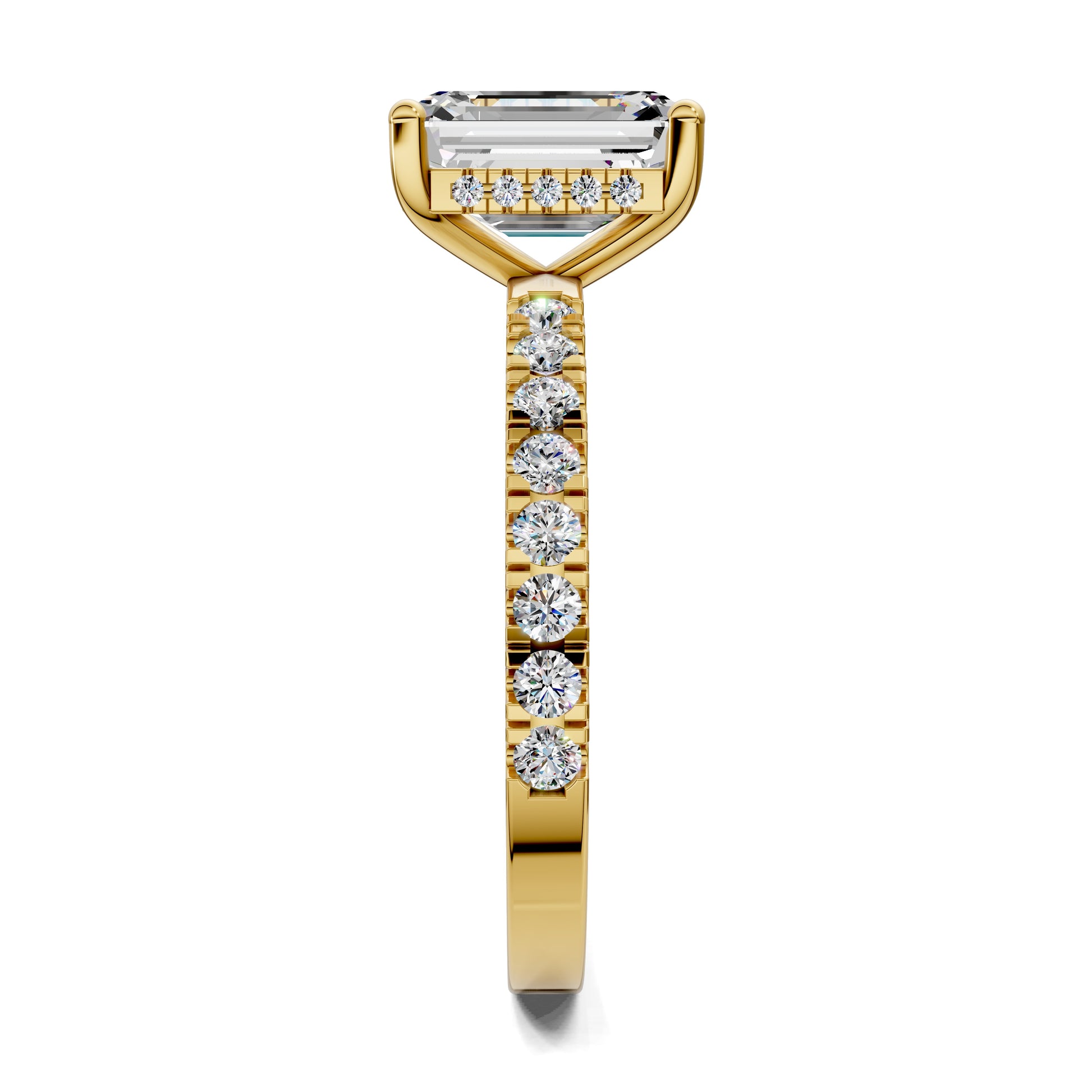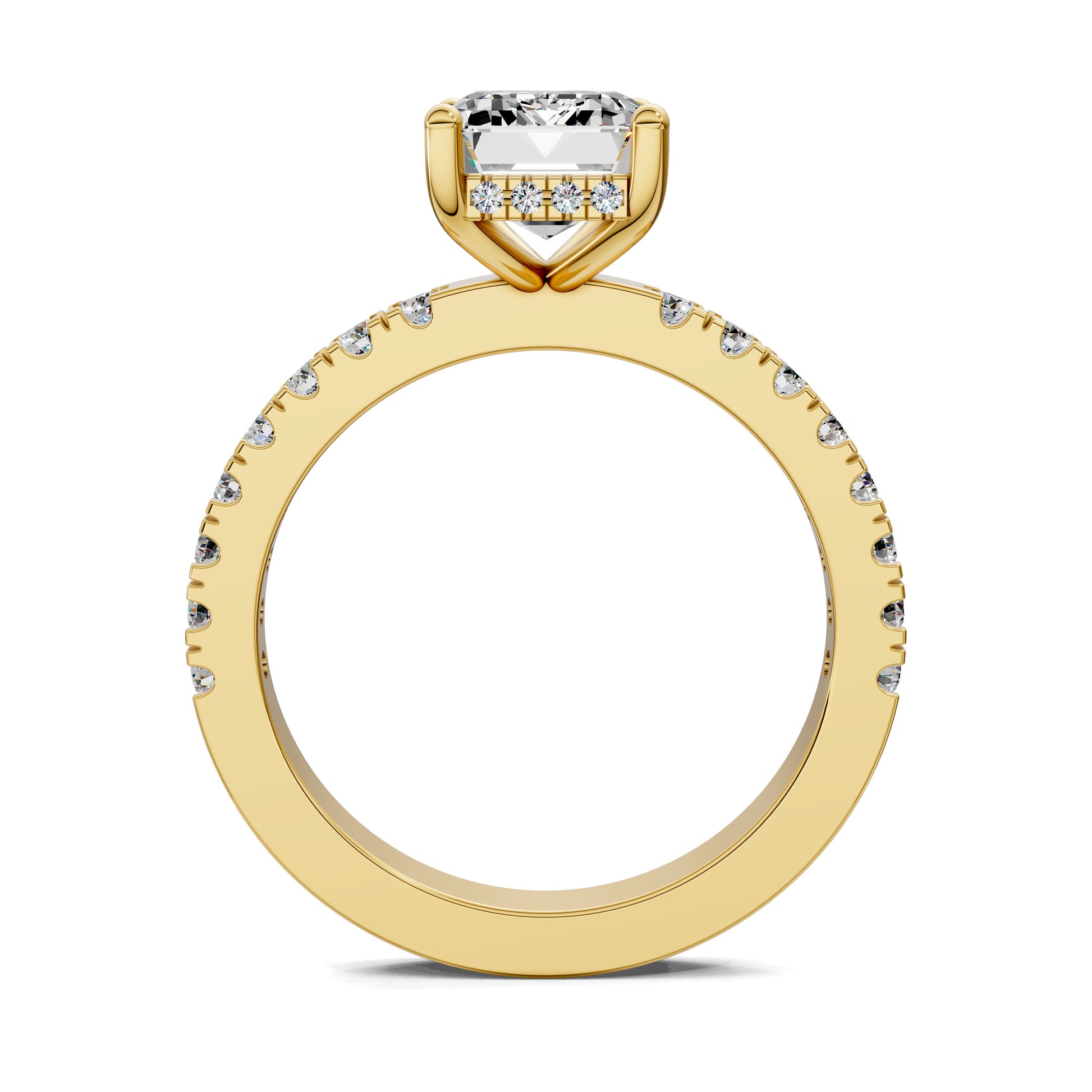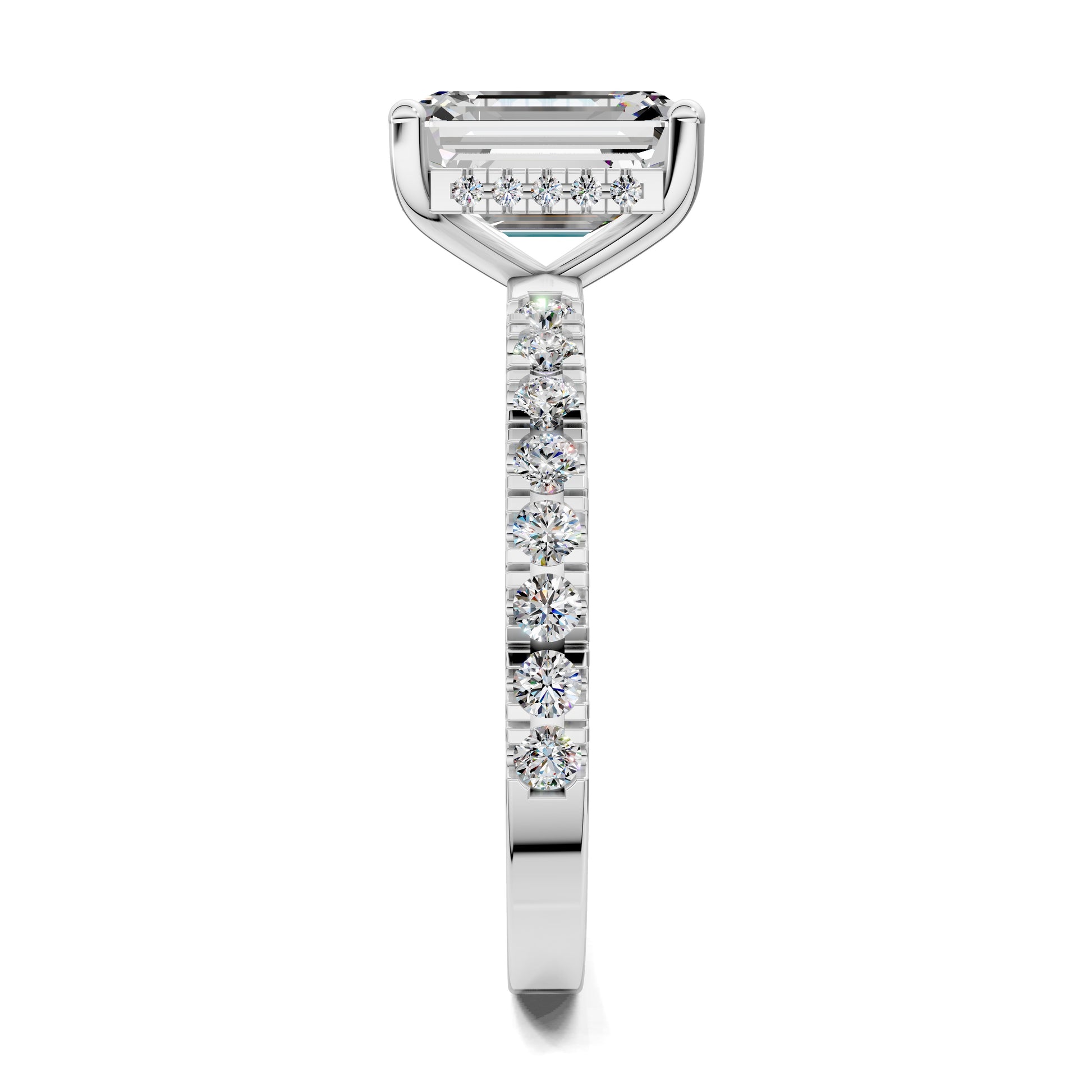 An emerald cut diamond reveals its hall-of-mirrors brilliance, enhanced by a hidden halo and pavé-set band. A design that reflects clarity, strength and refined beauty.